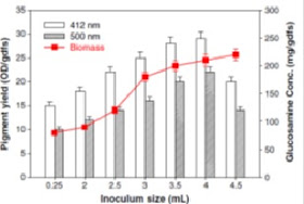 • Tamaño del inóculo: si tenemos una pequeña cantidad de hongo la biomasa será insuficiente y habrá poco producto, mientras que a grandes cantidades de hongo, se producirá biomasa excesiva y se agotarán los nutrientes. Como se representa en la gráfica, con un tamaño de inóculo de 4 mL se obtiene la máxima producción de pigmento.